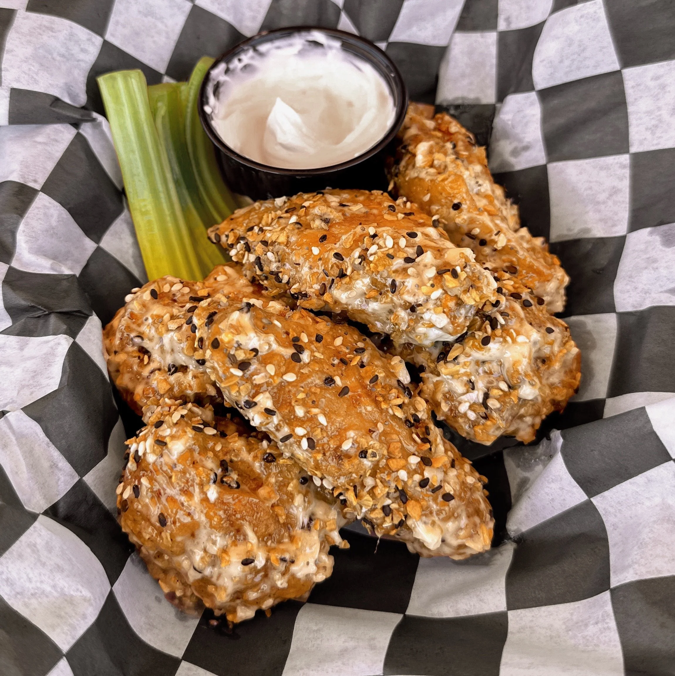 Forged with our classic Wingboy secret sauce, dusted in everything bagel seasoning, then baptized in a molten river of our homemade cream cheese + hot sauce dip.